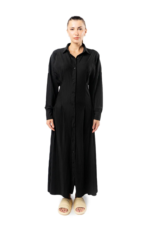 يُقدم متجر "سيلين" فستانًا نسائيًا أنيقًا باللون الأسود، يتميز بتصميم طويل مع أكمام طويلة ورقبة عالية، مما يمنح إطلالة راقية ومحتشمة. صُنع الفستان من مزيج عالي الجودة من 92% فيسكوز مجعد و8% إيلاستين، مما يضمن راحة ومرونة عالية عند الارتداء.