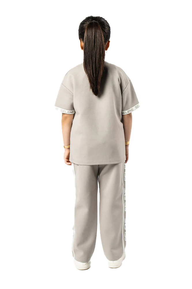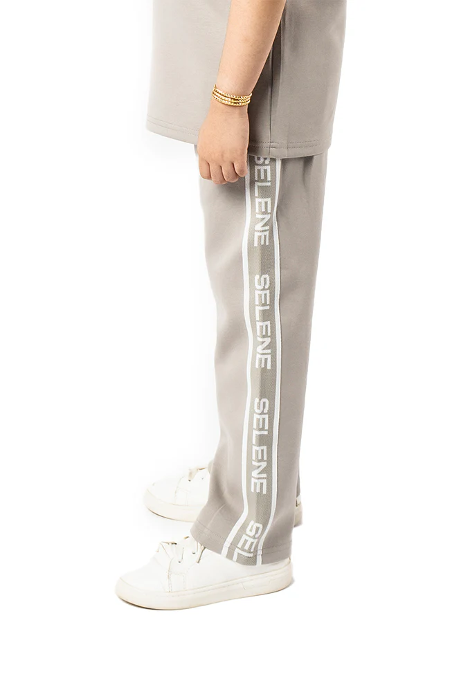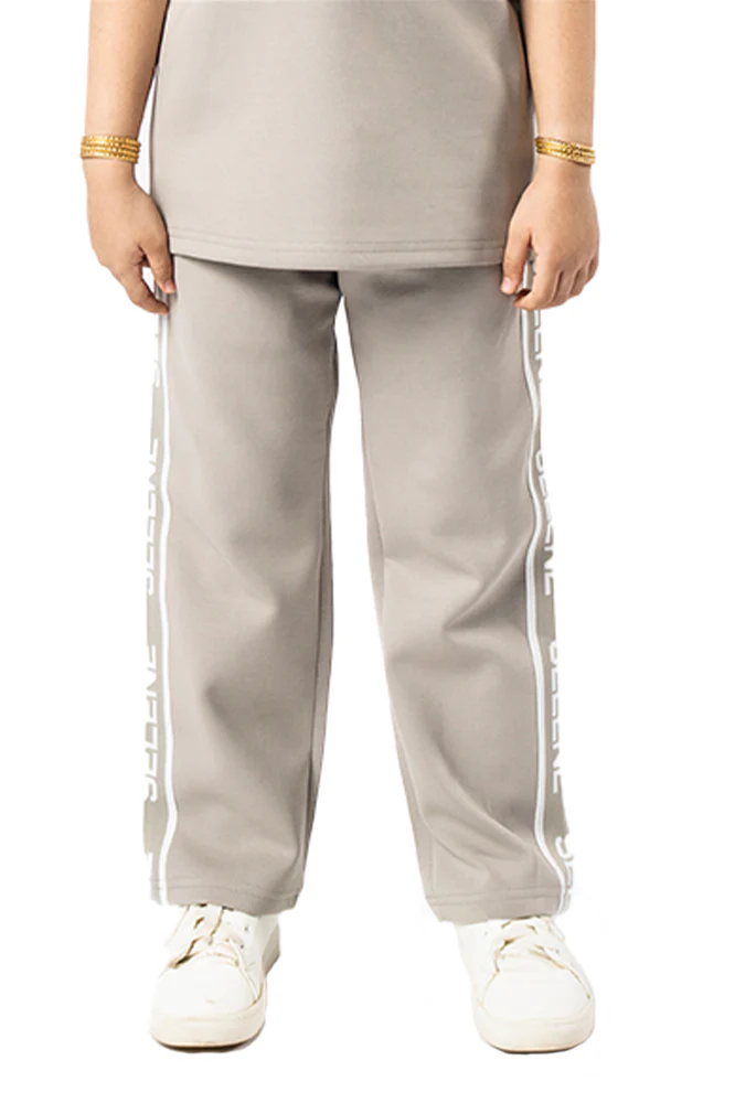 بنطلون رمادي بقصة مستقيمة للأطفال مع حزام خصر وأربطة وجيوب جانبية وشعار مطبوع على الجانبين