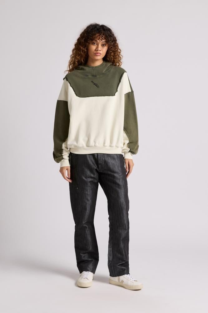 هودي بقصة واسعة ورقبة عالية بشعار سيلين للجنسين أخضر غامق + أوف وايت